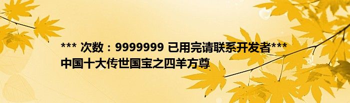 本文*** 次数:9999999 已用完请联系开发者*** 中国十大传世国宝之四羊方尊到此分享完毕,希望对大家有所帮助。
