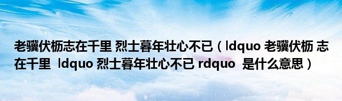 1、释义 “老骥伏枥,志在千里;烈士暮年,壮心不已”意思是老的千里马虽然伏在马槽旁,雄心壮志仍是驰骋千里;壮志凌云的人士即便到了晚年,奋发思进的心也永不止息。