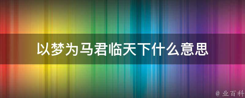 以梦为马,君临天下的意思是用理想或梦想作为动力,努力追求目标,最终实现卓越的成就。以梦为马表示将自己的梦想或理想当作坚强的马匹,象征着坚持不懈、积极进取的精神状态。君临天下则代表取得巨大的成功,掌握权力,成为独一无二的统治者或领袖。