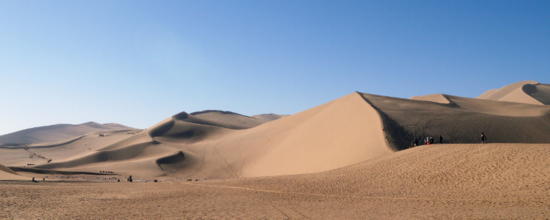 敦煌沙漠的西侧是库姆塔格沙漠,东侧是中国第三大的巴丹吉林沙漠。敦煌的沙漠叫鸣沙山,位于敦煌市西南七公里处,是一处神奇的沙漠奇观。沙丘因人登之即鸣,故曰鸣沙;沙山中泉水形成一湖,酷似一弯新月,故曰月牙。