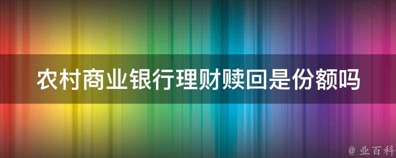 农村商业银行理财赎回是份额。份额代表的是数量,农行理财赎回份额代表的是投资者赎回的数量,持有份额*理财净值(净值就是价格)=理财本金。理财到期后本金和收益会自动转入投资者账户中,不需要投资者手动赎回。