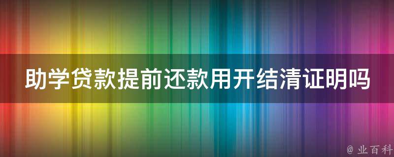 助学贷款提前还款用开结清证明。如果借款人想要提前还助学贷款,那么在还完款项后,可以携带身份证、贷款合同等资料,前往贷款银行办理贷款结清证明。有了该证明,借款人后续就不需要担心会因未还完贷款而影响个人征信。