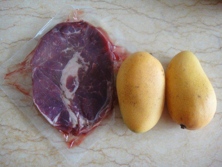 1、食材准备:牛排150克、芒果200克、芦笋2根、橄榄油、盐、彩椒、水淀粉各适量。