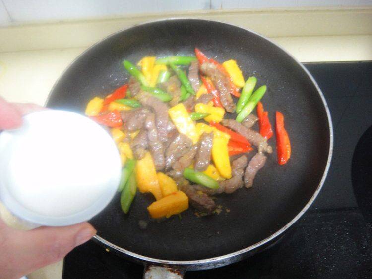 6、温油下入牛柳翻炒至变色。