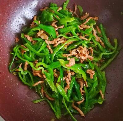 4、倒入青椒丝,翻炒均匀,加入盐继续翻炒三分钟即可。
