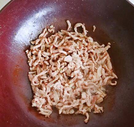 2、锅里放入油烧热,放入肉丝翻炒均匀,继续翻炒到肉丝微微卷起来。