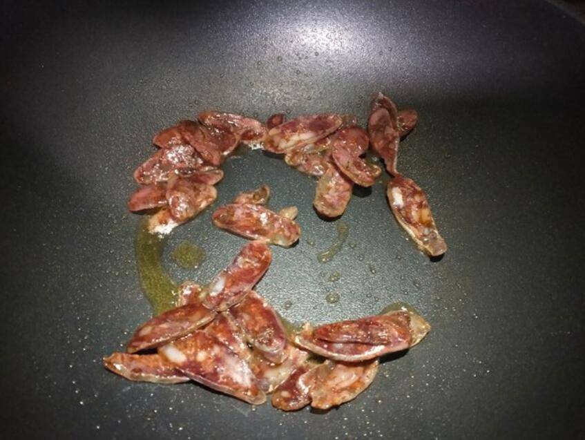 3、锅里倒入切好的腊肠,炒香。