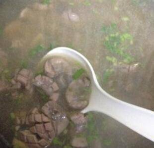4、锅倒油,放姜丝爆香,倒腰花快速翻炒,锅里加水,大火煮沸五分钟,加盐、鸡精调味,撒上葱花香菜即可。