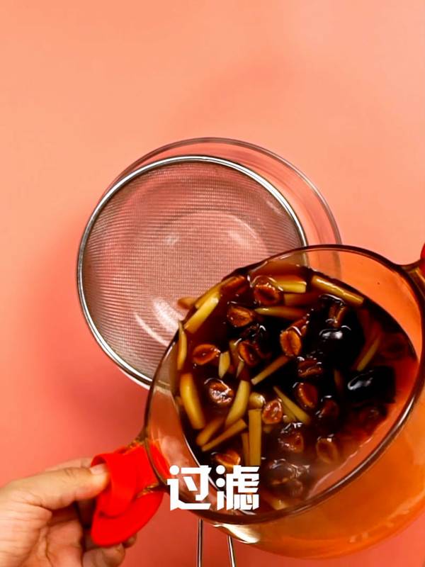 4、锅中加水、糖、罗汉果、姜、梨,小火煮30分钟后过滤。