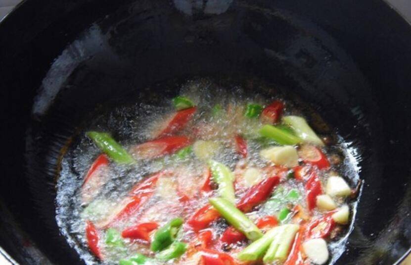 3、尖椒斜切成段,大葱切段,大蒜切片。