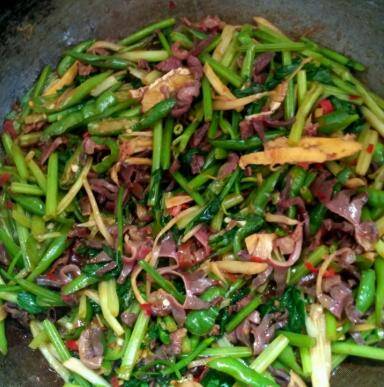 4、放嫩姜丝,青尖椒,芹菜杆儿一起翻炒,适量的放点盐,因为之前放了豆瓣酱,放多了会很咸,最后放芹菜叶子炒两下,再放点鸡精翻炒均匀就可以出锅了。