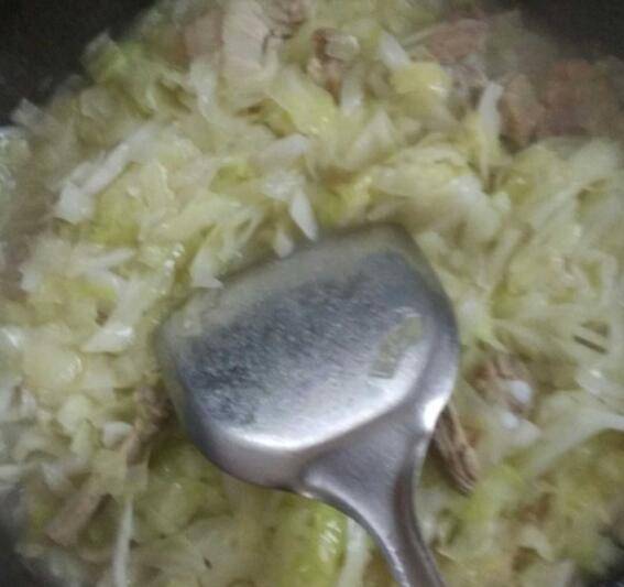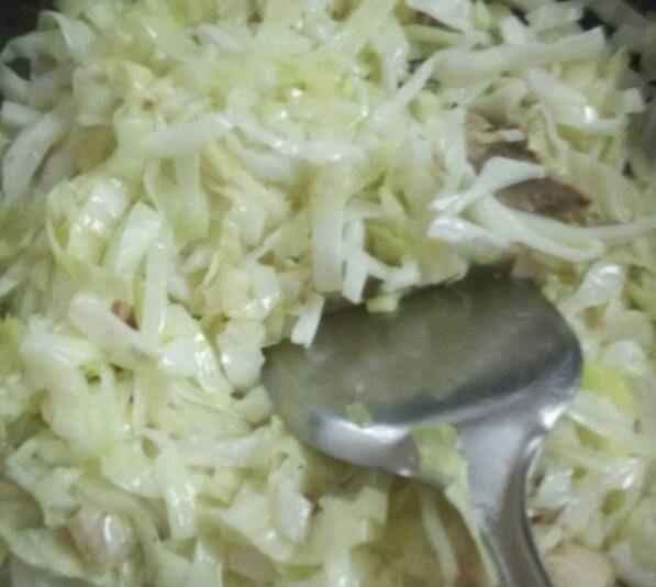 4、倒入卷心菜一起炒。