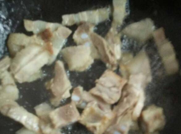 3、锅中倒油,再放入肉片翻炒片刻。