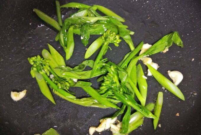 3.爆香蒜末后放入芥兰翻炒。