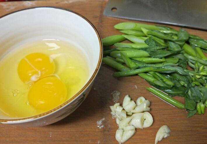 1.准备好鸡蛋,芥兰、蒜切好。