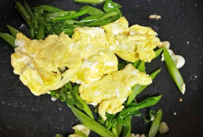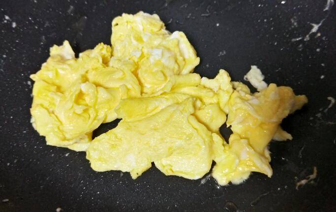2.鸡蛋用油炒熟,然后盛出备用。