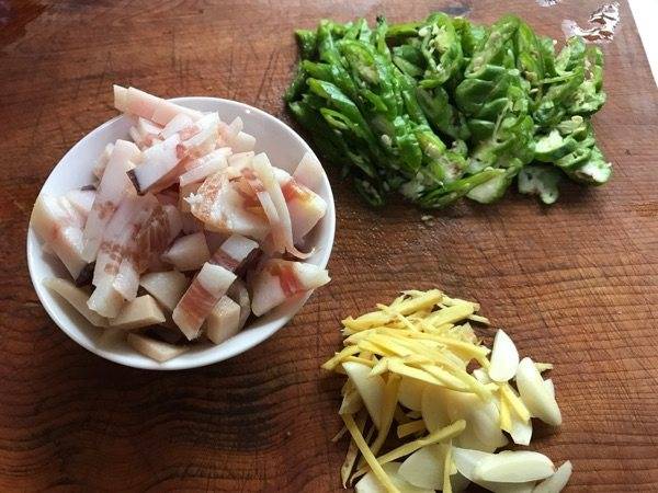 3、火腿、青椒、生姜切丝,大蒜切片。