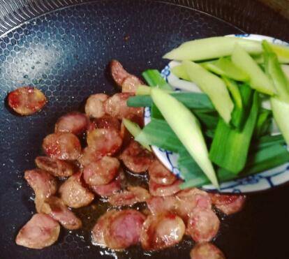 1、锅里放油,放入香肠煸炒。