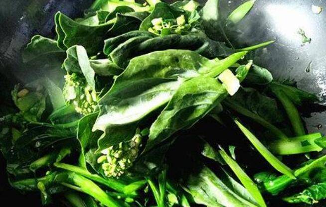 6、放入切好的芥兰叶,这样能保证杆和叶差不多同时熟,继续大火力翻炒3-5分钟。