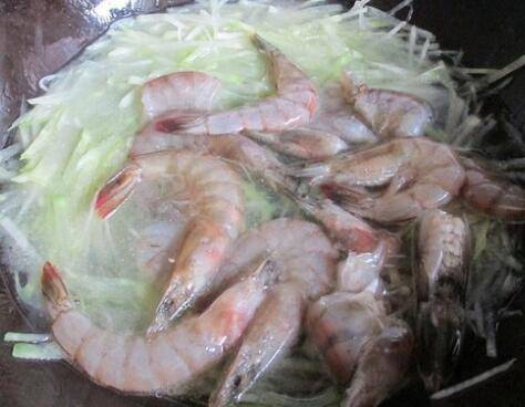 4、倒入萝卜丝煸炒,然后加水,再放入海虾。