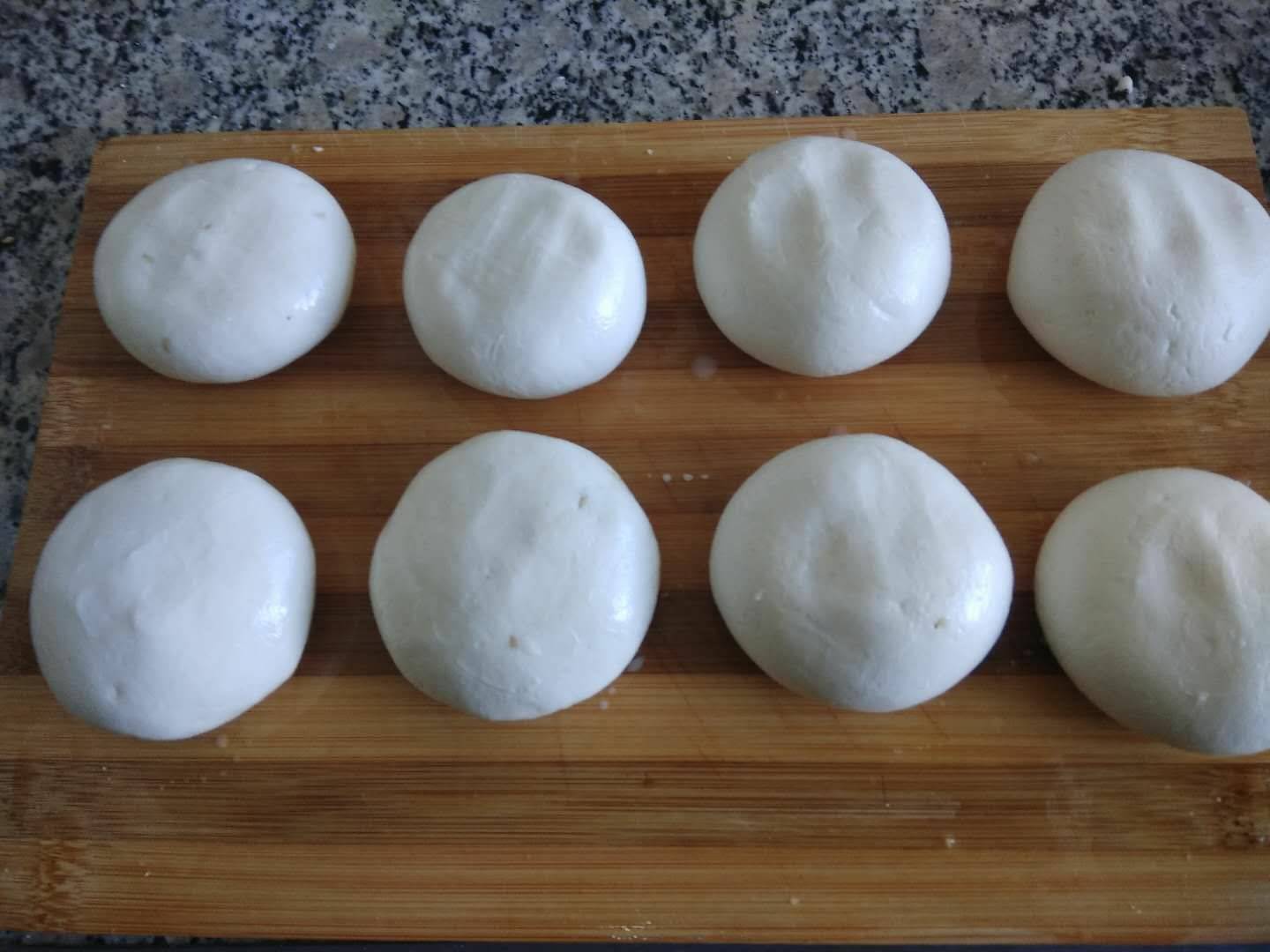 4、将发好的面团分成八个剂子,按扁后放入馅料。