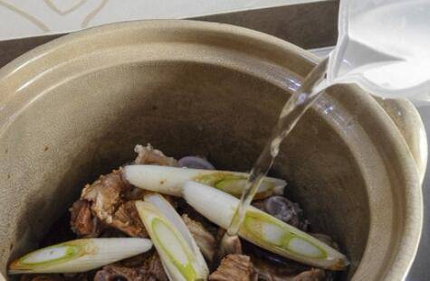 3、另起砂锅,放入焯水后的羊蝎子,放入葱段,放入淡盐酱油。