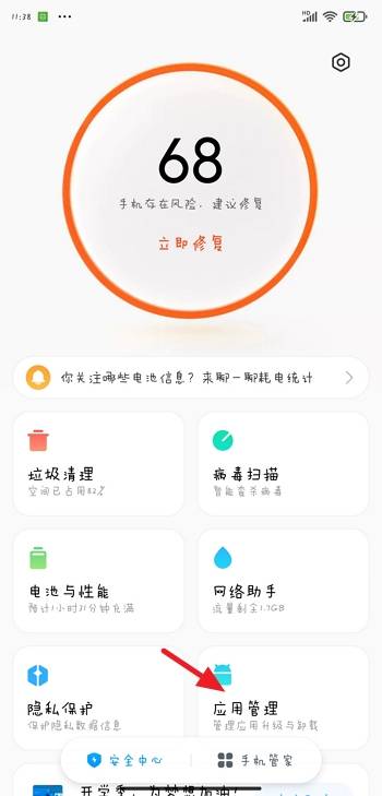 2、打开【手机管家】,点击【应用管理】。