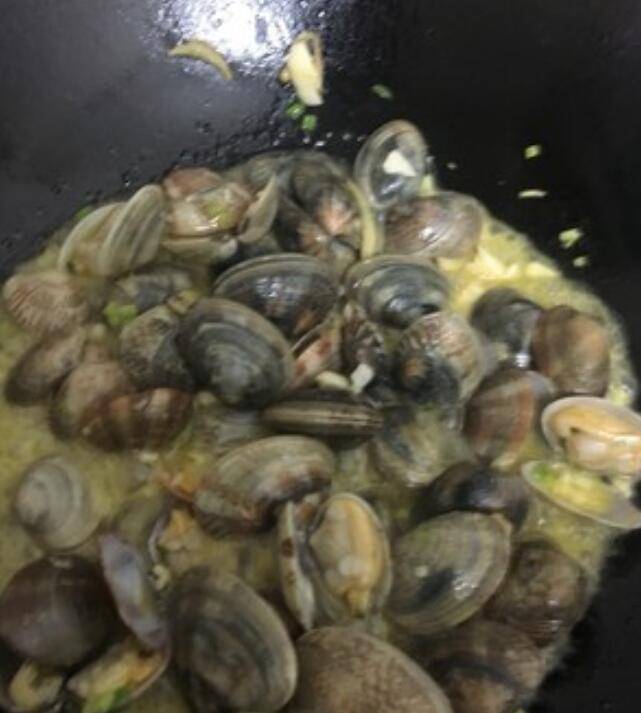 4、至七成热倒入沙甲,加入适量料酒,翻炒,微微开壳的时候,放入葱白,会很香。