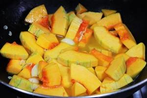 5、倒入南瓜翻炒,加适量的盐,再倒入适量的水加盖烧。