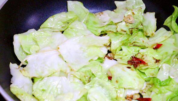 9、调入盐、白醋和少许白糖,翻炒至卷心菜断生即可。