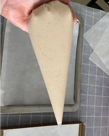 7、把虾泥挤好、上面铺一张油纸、随便找一个圆的平面模具一个个压一下,注意不能压太薄,不然烤起来容易焦。
