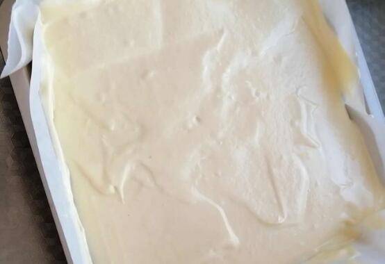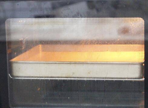 7、倒入模具中,用刮刀或是平底铲抹平表面,将烤盘放在另一个烤盘里,另一个烤盘里加入1~2厘米的水,145-150度烤60-70分钟即可。