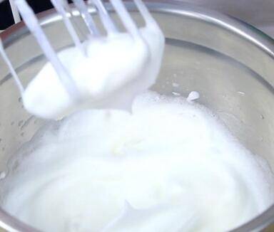 5、用打蛋器打至粗性发泡后继续加入细砂糖,继续打至蛋白接近硬性发泡。