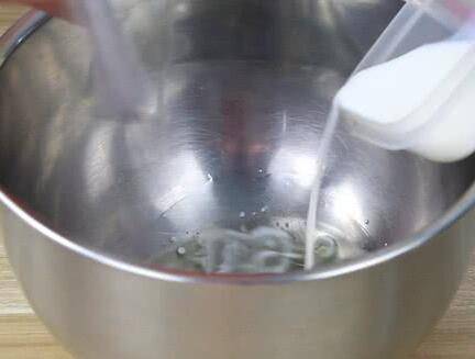 2、牛奶和色拉油加入打蛋盆中,搅拌均匀。