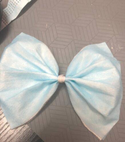 把中间剪出来的一部分慢慢一层层折起来,用口罩做蝴蝶结发卡。