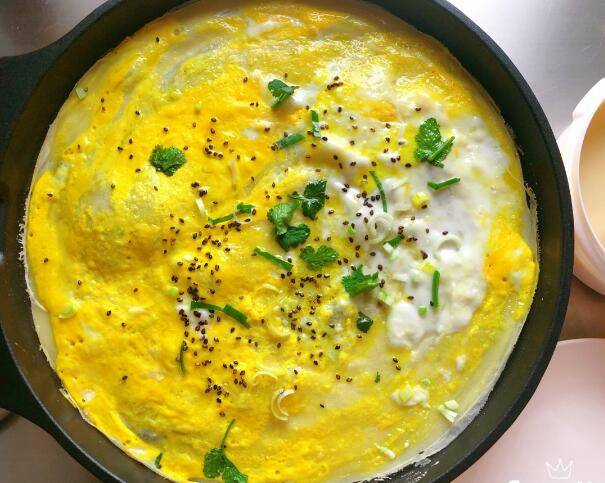 4、翻面,刷上酱料,放入薄脆饼、肠、生菜、葱花、香菜等配菜即可。