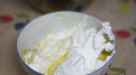 7、将拌好的蛋黄糊全部倒进余下的蛋白盆中,用同样的手法翻拌均匀,直到蛋白和蛋黄糊充分混合。