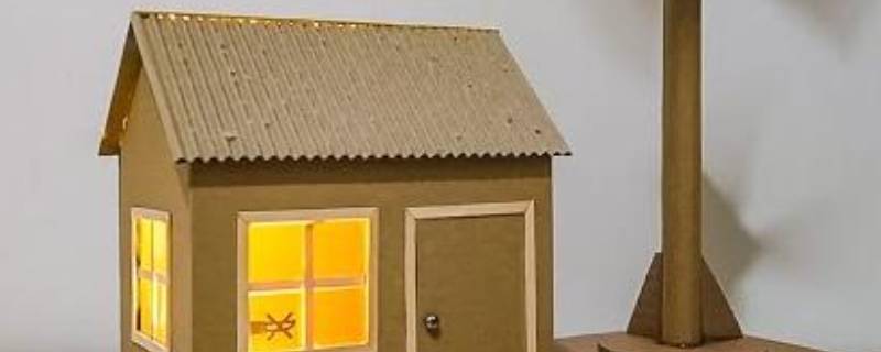 2、将小纸盒切割做出小屋的形状,再另外用瓦楞纸剪出两片长方形做屋顶。