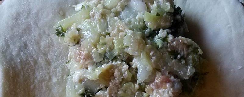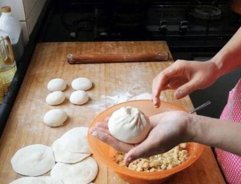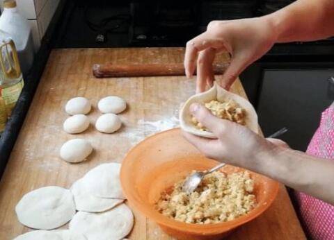 5、将面剂揉一下,擀成中间厚边缘薄的面皮,放入菜馅,托在手中,一只手拿褶,一只手拇指挡住菜馅。