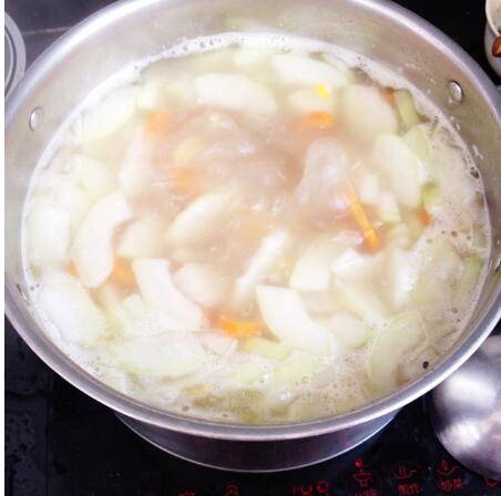 5、排骨炖好以后,把切好的冬瓜和胡萝卜一起倒到锅里,加适量的盐,中火炖10分钟左右就可以出锅了。