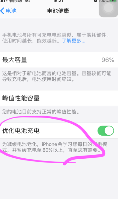 关闭优化电池充电功能,iPhone手机将不会学习记录每天得充电模式,手机充电将充到100%为止。