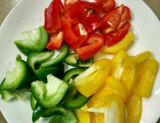 3、青、红、黄椒洗净切成小块。