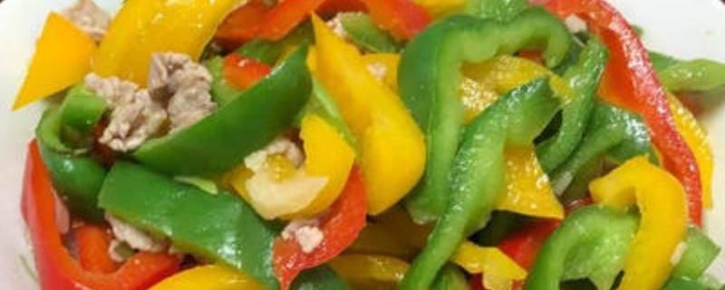 8、放入青、红、黄椒翻炒至快熟。