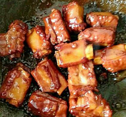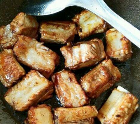 将肋排倒入锅中,翻炒至每块排骨都均匀裹上糖色。