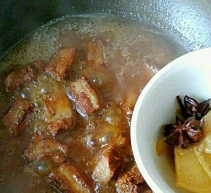 往锅里倒入足量热水(开水较佳)使其没过排骨,再加入姜片、葱段、八角、生抽,盖上锅盖大火烧开后转成小火,焖煮45分钟左右。
