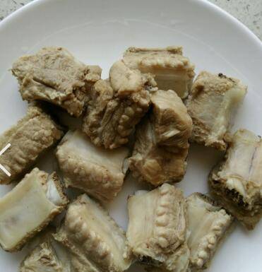 肋排洗净,冷水下锅,烧开后加一点料酒煮几分钟,捞起。