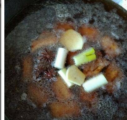 45分钟后排骨可以很轻松用筷子插入了,锅里差不多还剩下1/3的汤汁,此时用筷子把姜片葱段八角捡出来不要。