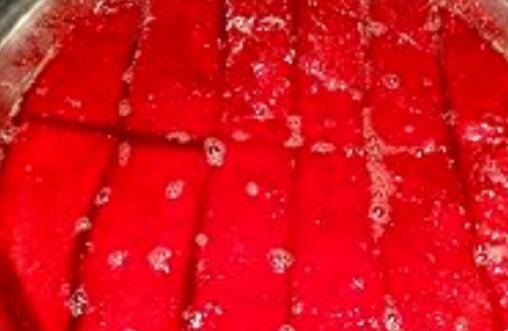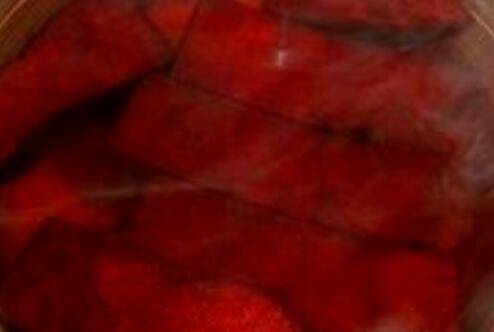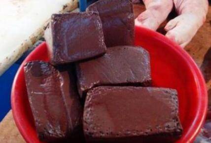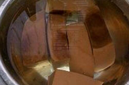 3、等锅中的水烧到80度,放入血块。加盖小火焖30至40分钟。