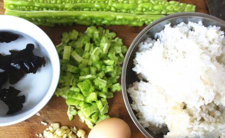 1、准备1碗剩米饭,1只鸡蛋,苦瓜1/2根切成丁,黑木耳提前泡发,撕成小朵,蒜切末。