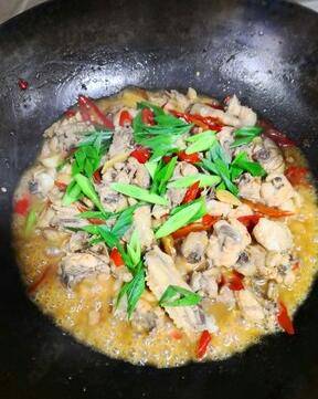 最佳答案准备食材:鸡1只、姜适量、蒜5瓣、泡椒八个、大蒜叶适量。鸡剁小块,姜,切片,大蒜切粒,大蒜叶切斜片,泡椒切斜片。三黄鸡焯血水,洗净。冷油下锅爆香姜片。鸡块下锅,加盐适量,生抽一勺,小火炒香。放入泡椒,大蒜粒,翻炒一会儿。加小半碗水,盖上盖焖一会儿。出锅前撒大蒜叶,继续盖盖焖一分钟。